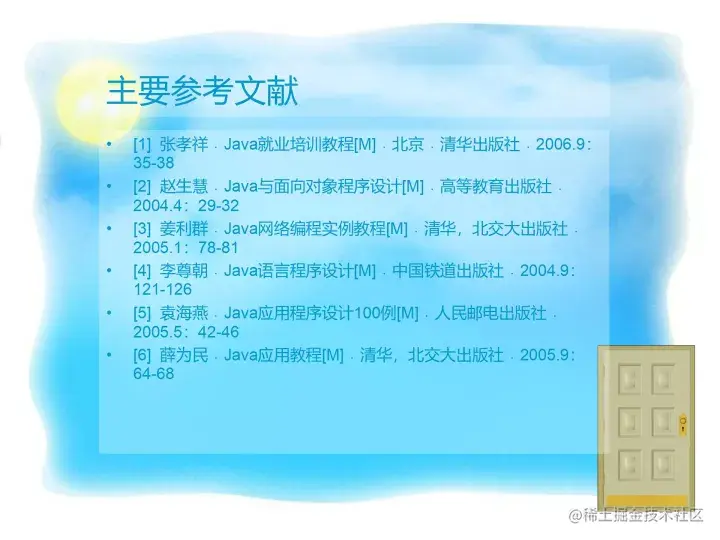 - [5] 袁海燕﹒Java应用程序设计100例[M]﹒人民邮电出版社﹒2005.5:42-46