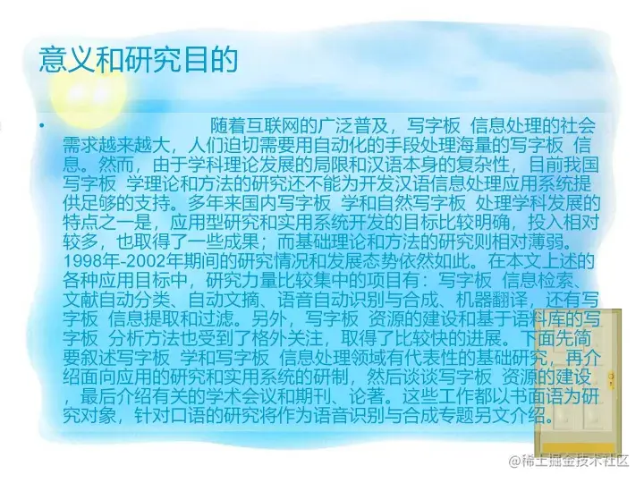 - 随着互联网的广泛普及,写字板 信息处理的社会需求越来越大,人们迫切需要用自动化的手段处理海量的写字板 信息。然而,由于学科理论发展的局限和汉语本身的复杂性,目前我国写字板 学理论和方法的研究还不能为开发汉语信息处理应用系统提供足够的支持。多年来国内写字板 学和自然写字板 处理学科发展的特点之一是,应用型研究和实用系统开发的目标比较明确,投入相对较多,也取得了一些成果;而基础理论和方法的研究则相对薄弱。1998年-2002年期间的研究情况和发展态势依然如此。在本文上述的各种应用目标中,研究力量比较集中的项目有:写字板 信息检索、文献自动分类、自动文摘、语音自动识别与合成、机器翻译,还有写字板 信息提取和过滤。另外,写字板 资源的建设和基于语料库的写字板 分析方法也受到了格外关注,取得了比较快的进展。下面先简要叙述写字板 学和写字板 信息处理领域有代表性的基础研究,再介绍面向应用的研究和实用系统的研制,然后谈谈写字板 资源的建设,最后介绍有关的学术会议和期刊、论著。这些工作都以书面语为研究对象,针对口语的研究将作为语音识别与合成专题另文介绍。