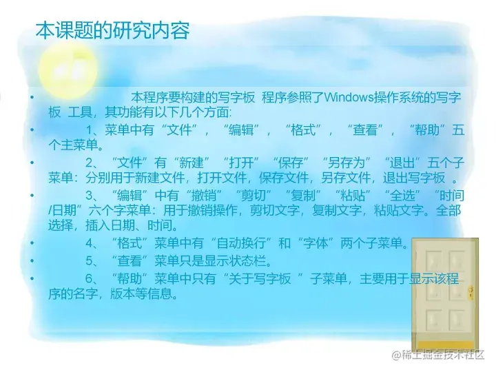 - 本程序要构建的写字板 程序参照了Windows操作系统的写字板 工具,其功能有以下几个方面:
