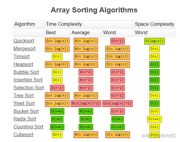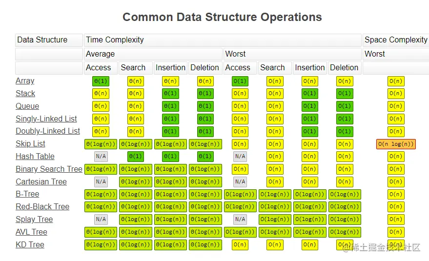 这个网站总结了常用算法的时空Big-O复杂性,常见数据结构操作的时间复杂度。
