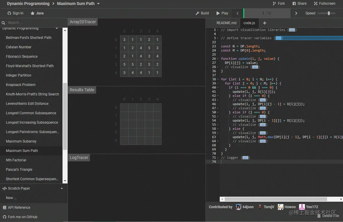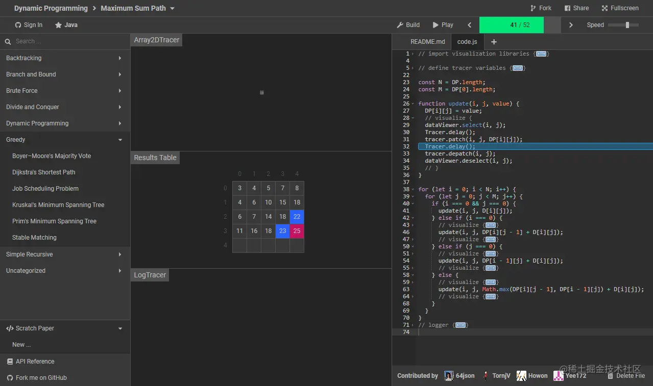 Algorithm Visualizer 是一个可视化代码算法的交互式平台,内含多种算法(回溯、动态规划、贪心等)并进行了可视化动画呈现,让学习算法和数据结构更加直观。