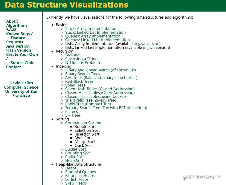 该网站由 Steven Halim 博士开发,对于理解数据结构与算法非常有帮助。网站里面包含了排序、链表、哈希表、二叉搜索树、递归树、循环查找等常见算法动画。
