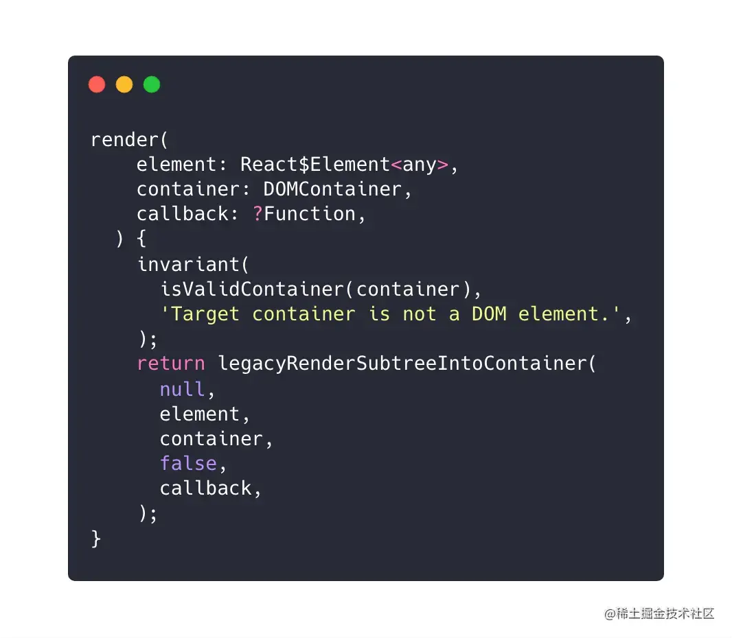 这句代码告诉了 React 应用我们想在容器中渲染出一个组件,这通常也是一个 React 应用的入口代码,接下来我们就来梳理整个 render 的流程,并且会分为几篇文章来讲解,因为流程实在太长了。