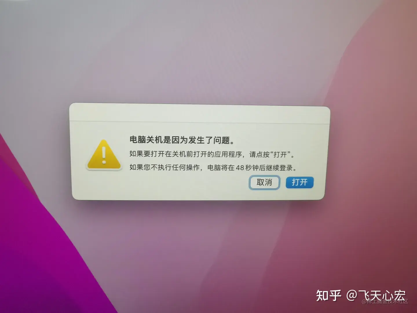 Mac异常关机,如突然断电后。再开机就会弹出“电脑关机是因为发生了问题”的提示窗口。