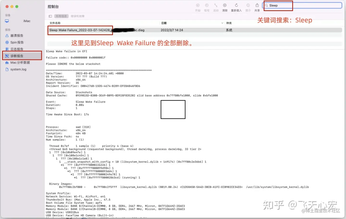 点击控制台中左侧的“诊断报告”,然后搜索 Sleep Wake Failure ,其实搜索Sleep关键词就够了