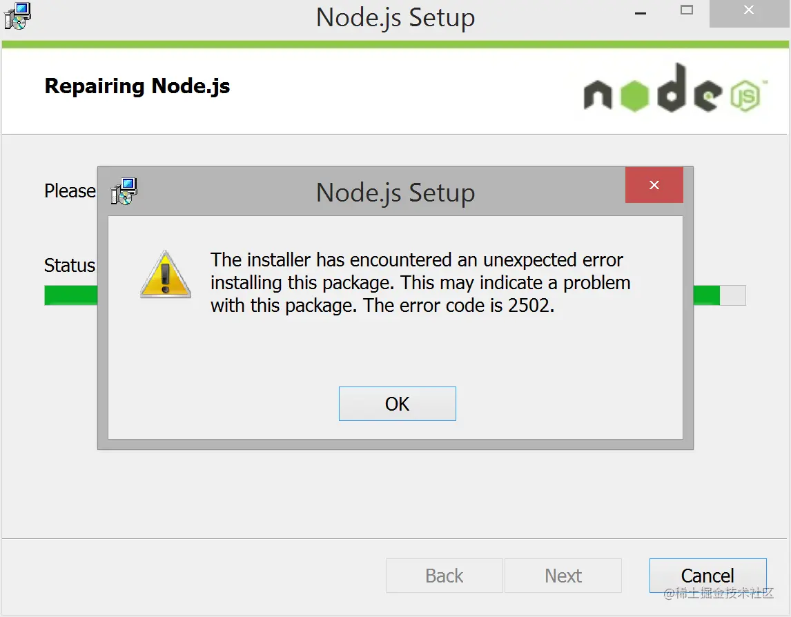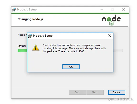 解决在安装 Node 的过程中出现代码为 2502 和 2503 的错误。