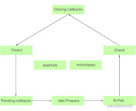 当微任务事件队列中存在可以执行的回调函数时,事件循环在执行完当前阶段的回调函数后会暂停进入事件循环的下一个阶段,事件循环会立即进入微任务的事件队列中开始执行回调函数,当微任务队列中的回调函数执行完成后,事件循环再进入到下一个阶段开始执行回调函数。