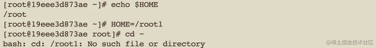 如图 2-1,HOME 原本的值是 /root,我将 HOME 赋值为 /root1,然后 cd ~ 切换到家目录,报没有 /root1 这个目录,说明操作系统是通过环境变量 HOME 来确定用户家目录的位置。