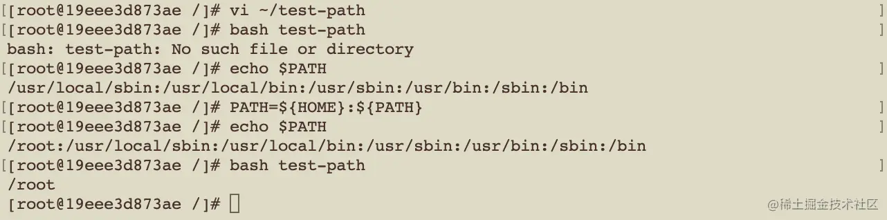 如图 2-3,我在用户家目录下新建了一个 test-path 脚本,这个文件只有一行代码 echo $HOME,然后我执行 bash test-path,报找不到文件或目录,这是因为家目录的路径不在环境变量 PATH 里面,我通过在 PATH 环境变量里面加入家目录的路径,再次执行 test-path 脚本,可正常运行。