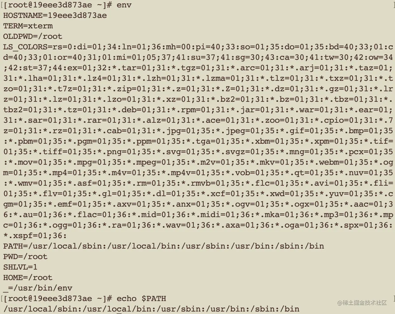 可通过 env 命令查看所有的环境变量,可通过 echo ${PATH} 或 echo $PATH 查看单个环境变量。如图 2-2。