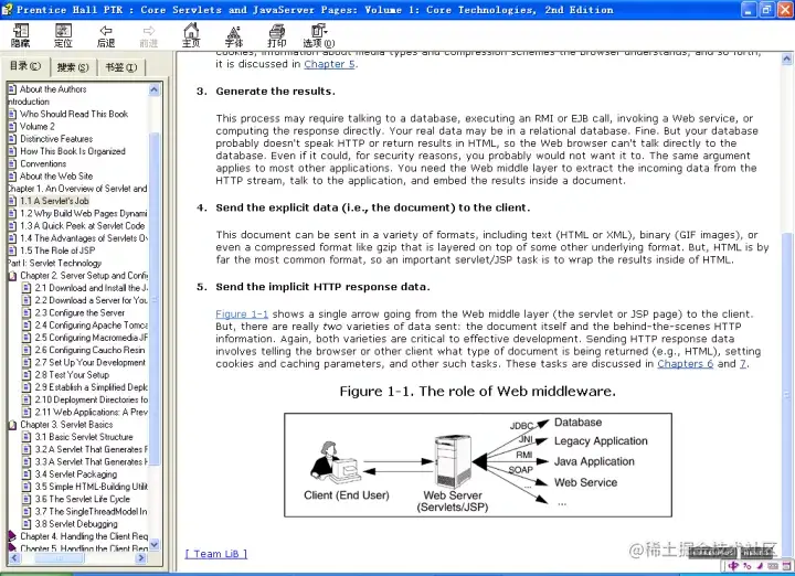 理论上讲,servlet并非只能用于处理HTTP请求的Web服务器或应用服务器,它同样可以用于其他类型的服务器。例如,servlet能够嵌入到FTP或邮件服务器中,扩展他们的功能。而且,用于会话启动协议服务器的servlet API最近已经被标准化(参见jcp.org/en/jsr/deta…)。但在实践中,servlet的这种用法尚不流行,在此,我们只论述HTTP Servlet。
