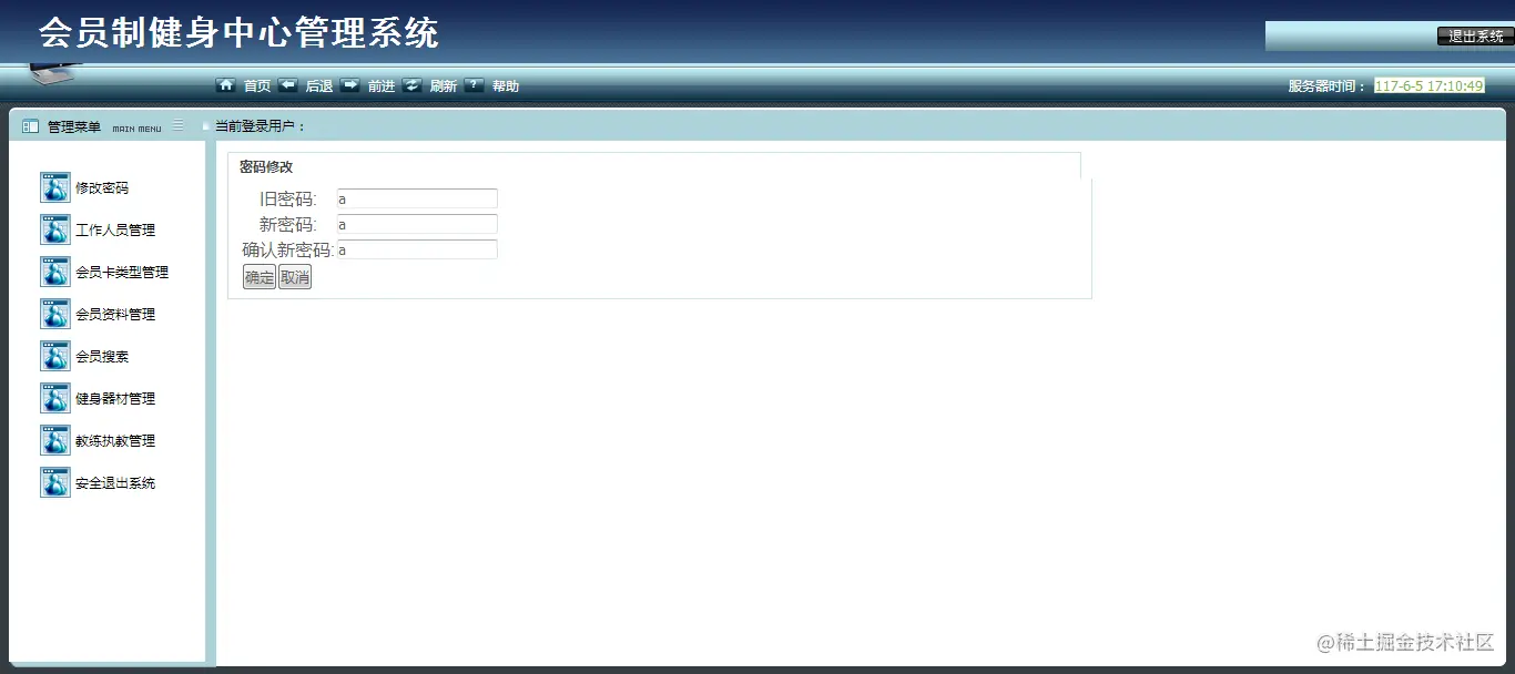 设计与实现信息管理系统要根据俱乐部对顾客及其员工管理的实际情况来设计。能更好的方便俱乐部对顾客、员工和健身设备进行集中的管理工作。本信息管理系统包括的功能为:修改登录密码、工作人员管理、会员卡类型管理、会员资料管理、健身器材管理、教练执教管理、安全退出系统。