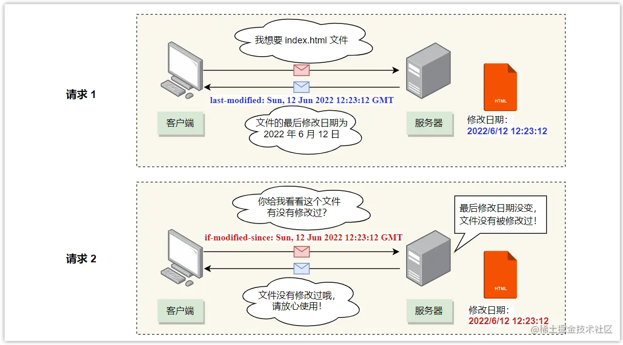 第一种(HTTP/1.0 规范):请求头部中的 If-Modified-Since 字段与响应头部中的 Last-Modified 字段: