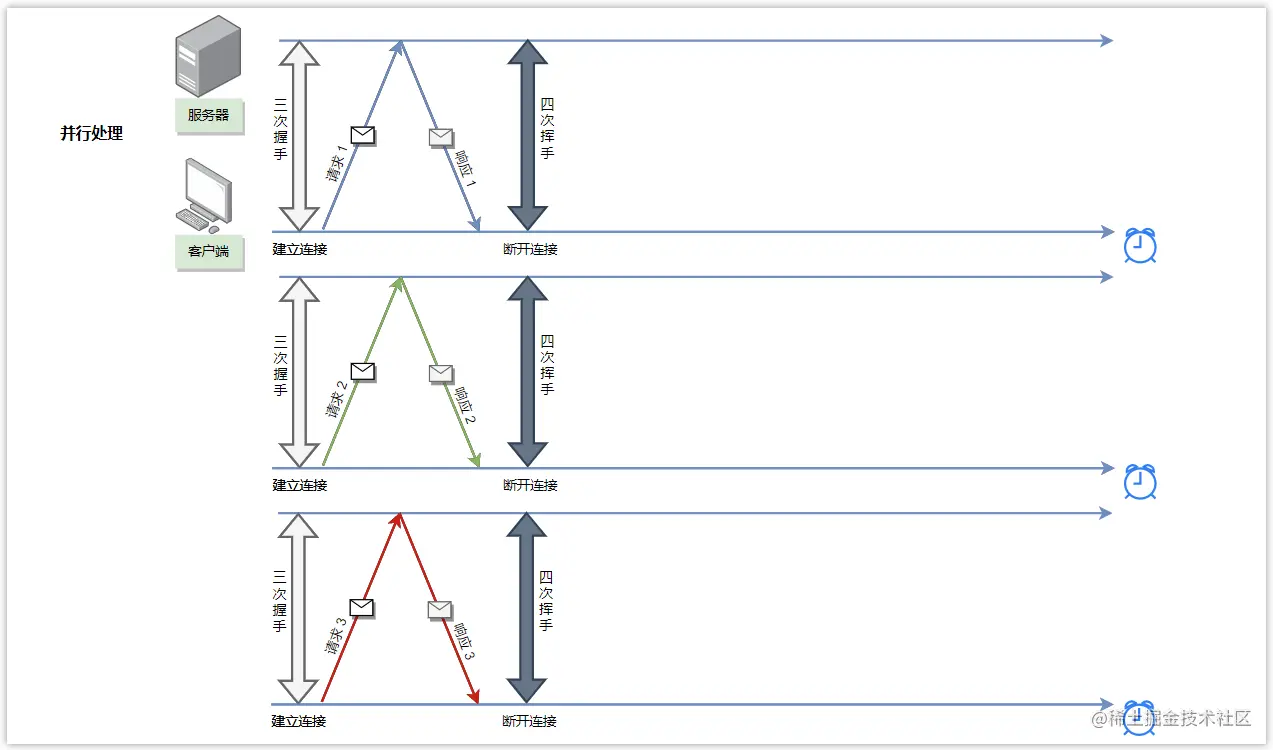 实际上,虽然管道机制的想法很好,但实现却非常困难,因而很多浏览器根本不支持它。一般为了提升性能,采用并行多个 TCP 连接的形式来实现请求的同时发送。