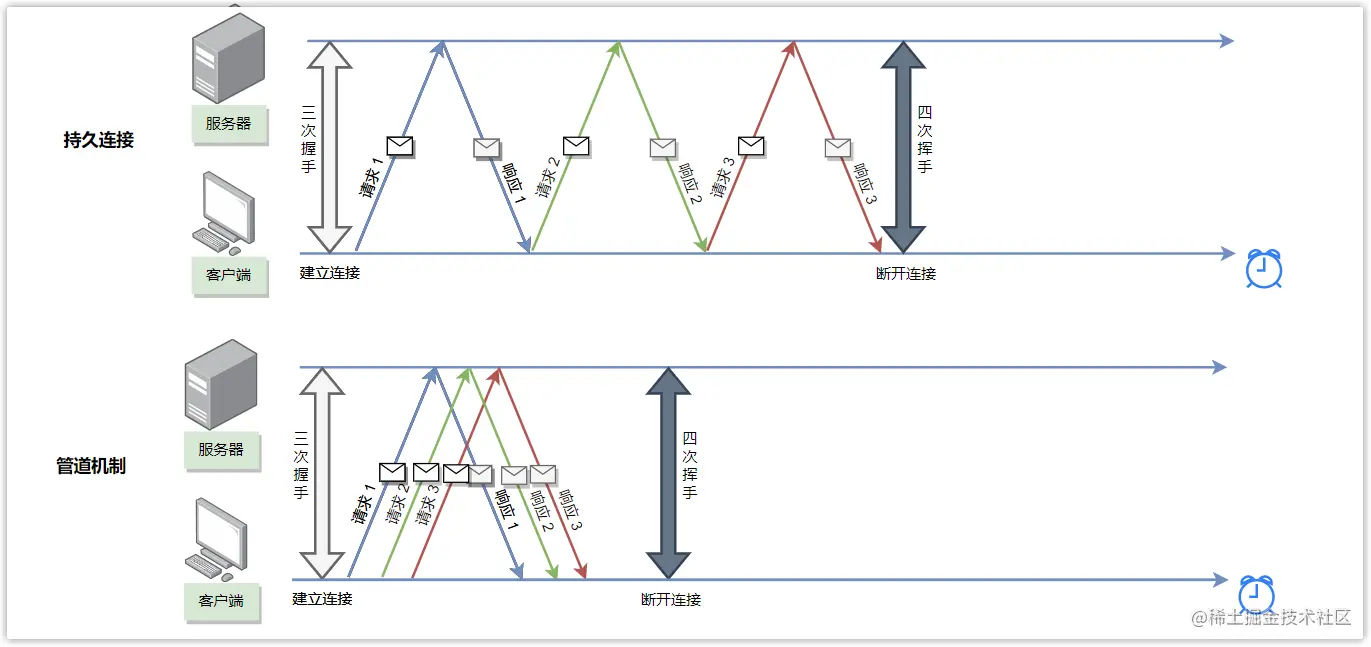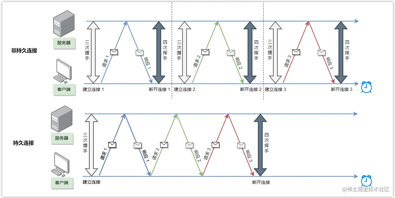比如打开一个 Web 页面时,假设该页面含有一个 HTML 基础文件和 2 张图片,如果客户端与服务器通过同一个 TCP 连接来获取这 3 个数据,则为持续连接,如果通过建立 3 次不同的 TCP 连接,则为非持续连接。