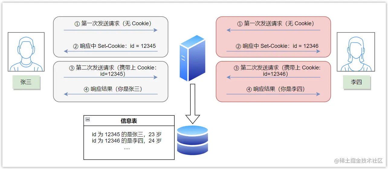 张三在发出第一次请求后,服务器将其状态信息记录下来,比如他的名字、年龄、地址、购物历史等,并通过响应头 Set-Cookie 字段,给予其一个 id=12345 的独特识别码作为 Cookie,那么其再次向服务器发出请求时,浏览器会自动在请求报文中的 Cookie 字段中带上 id=12345,服务器就可以通过这个查询到张三的具体信息,从而实现了保持状态的功能。