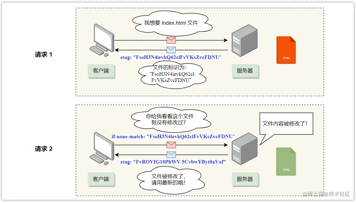 第二种(HTTP/1.1 规范):请求头部中的 If-None-Match 字段与响应头部中的 ETag 字段: