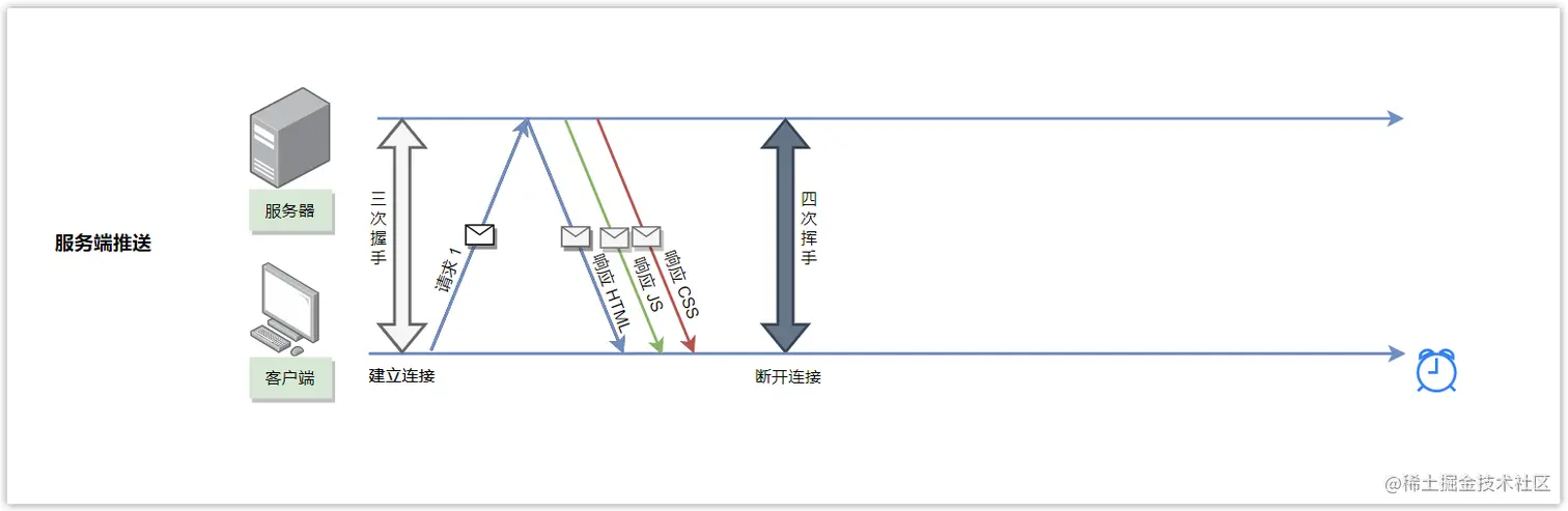 比如当客户端向服务器请求一个 HTML 文件后,服务器除了将此 HTML 文件响应给客户端外,还可以提前主动将此 HTML 中所依赖的 JS 和 CSS 文件推送给客户端,这样客户端在解析 HTML 时,无需耗费额外的请求去得到相应的 JS 和 CSS 文件。