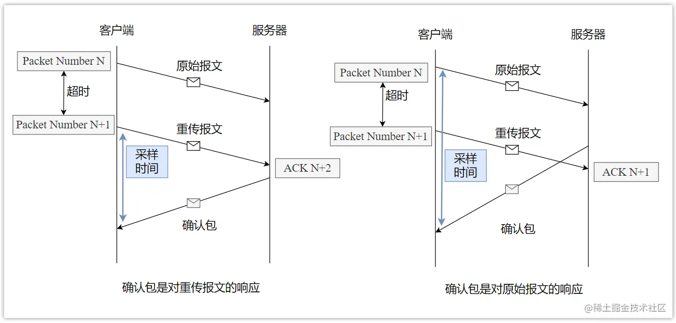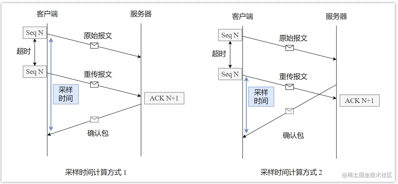 客户端发送一个序号为 N 的包,然后超时了,于是重新发送一个相同的包,但序号不再是 N,而是 N+1;那么如果返回的确认包 ACK 为 N+1,就是对原始报文的响应,如果 ACK 为 N+2,就是对重传报文的响应,因而采样时间计算相对更加准确!