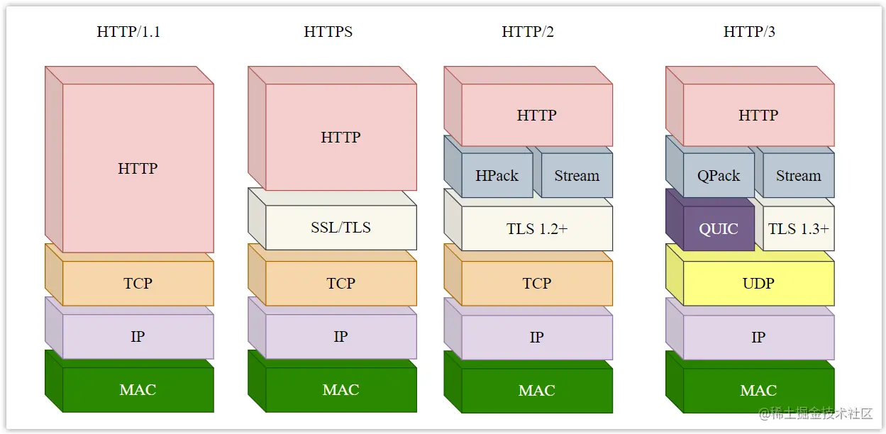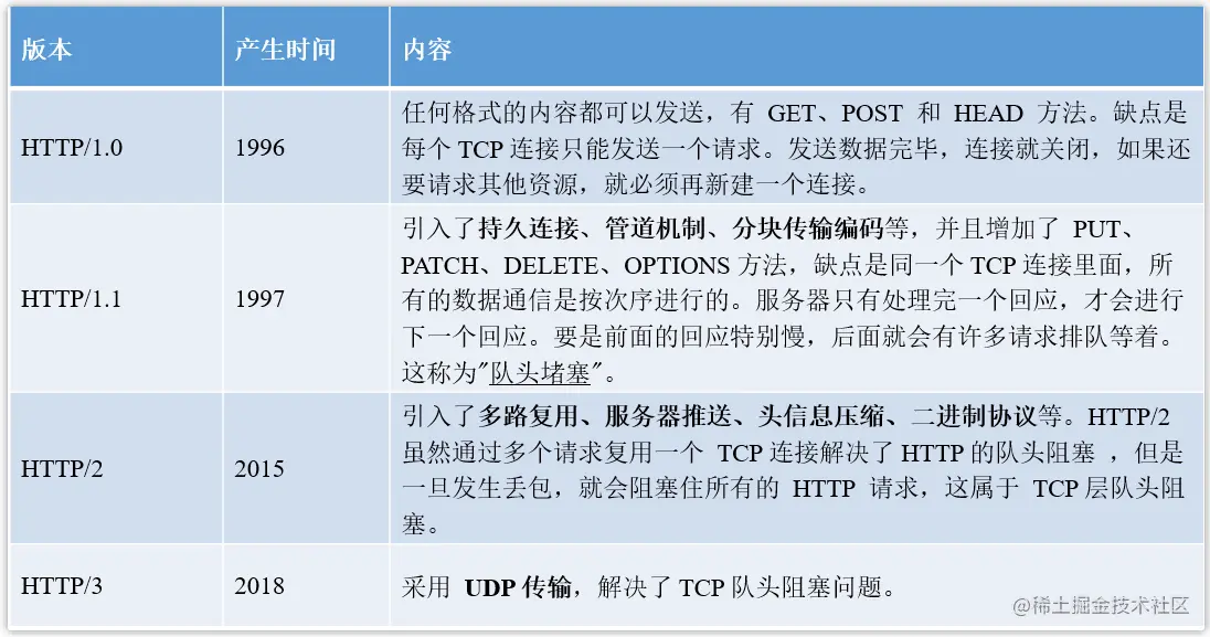随着互联网的发展,HTTP 也在不断升级打怪,下面分别介绍一下 HTTP1.1、HTTP/2 以及 HTTP/3 在前一版本的改进之处。