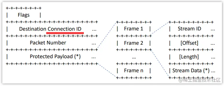 那此时怎么知道包 N 和包 N+1 是同一个包呢?QUIC 定义了一个 Offset 概念。发送的数据有个偏移量 Offset,可以通过 Offset 知道数据目前发送到了哪里,因而如果某个 Offset 的包没有收到确认,就重发。