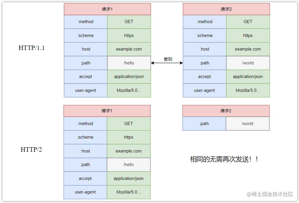 同时,多个请求中,如果请求头相同,则后续请求只需要发送差异的部分,重复的部分无需再发送。
