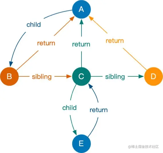 但React并不是这种方式,而是采用了通过指针来关联节点的方式:无论有多少个子节点,只存储一个child字段来指向第一个子节点;多个子节点中通过sibling指向下一个兄弟节点;所有的子节点都有return字段指向同一个父节点。