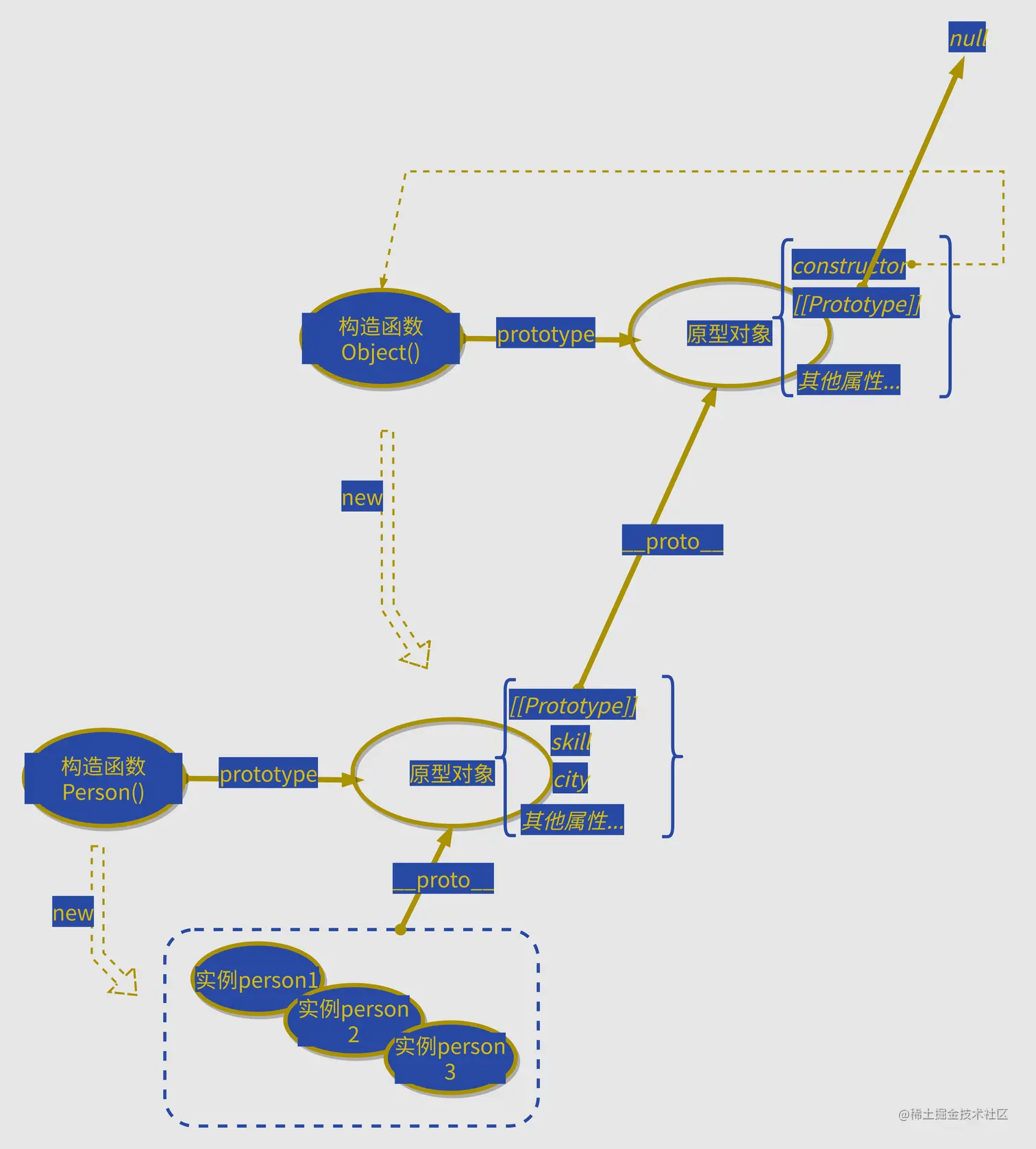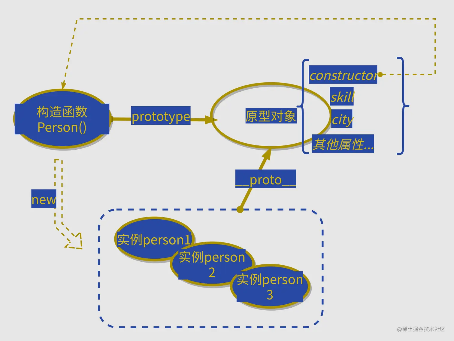 然后在这个例子中,我们再来梳理一下关于构造函数、实例、原型的一个关系,下面这个图就可以非常清晰明了的表达了: