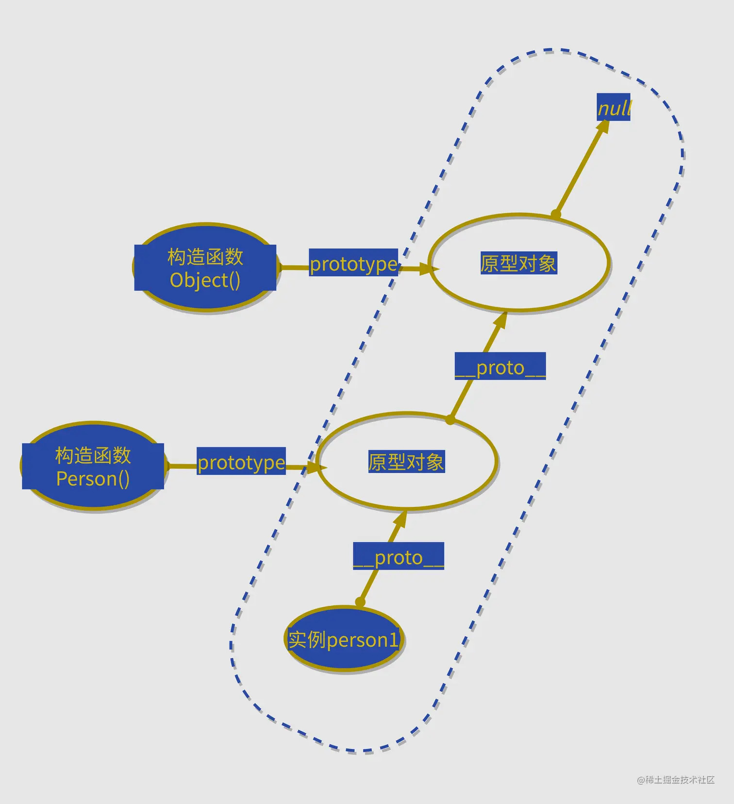 在JavaScript中,我们都知道每个对象都有一个[[Prototype]]指针指向其原型对象,而原型对象也是对象,所以原型对象也包含一个[[Prototype]]指针指向更上一层的原型对象。这就是形成我们常说的原型链的基础。