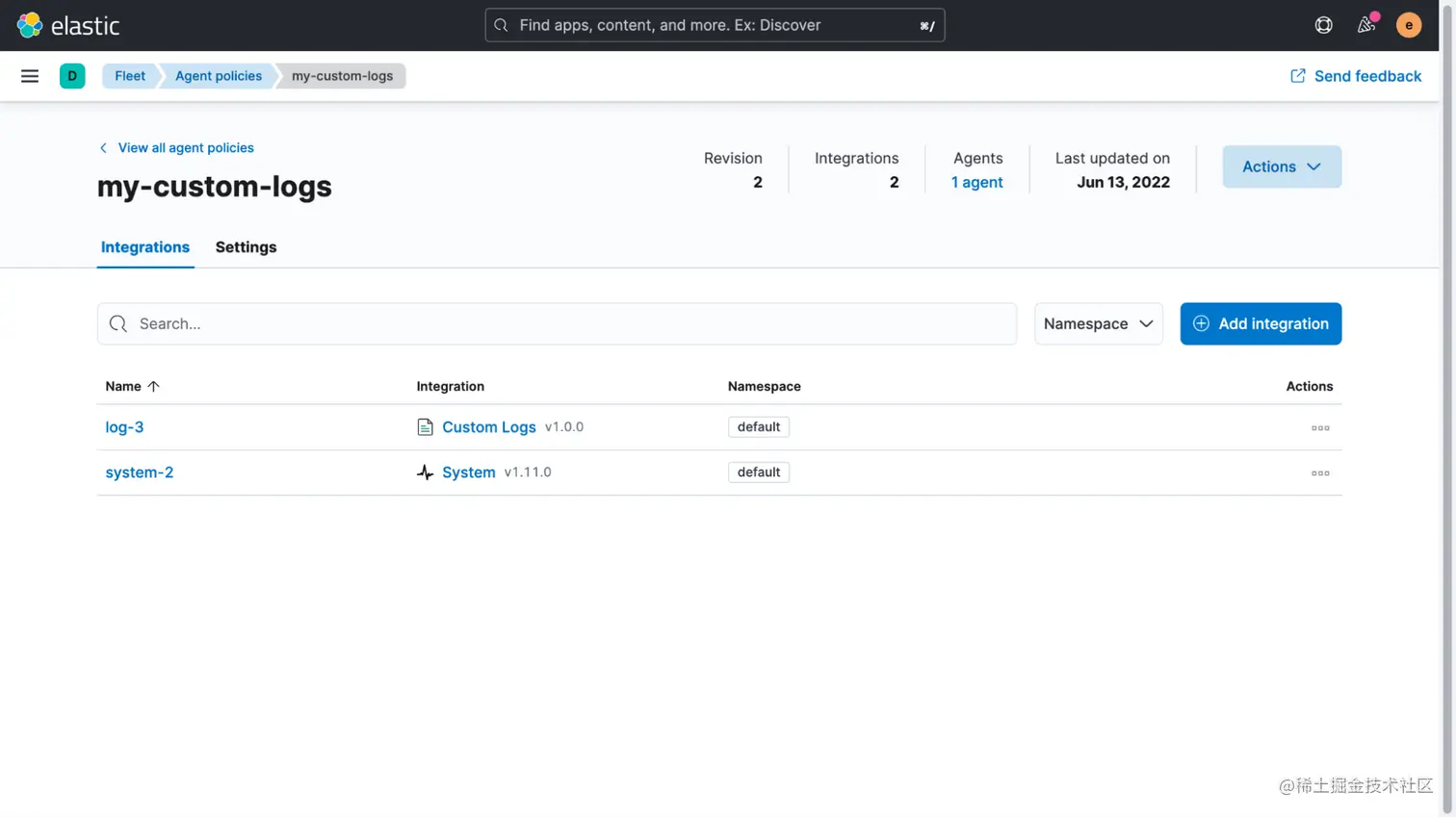 我们快完成了。 我们只剩下两个步骤来确保正确处理实时数据以及修复已经索引的旧数据。 首先从实时数据开始,我们将转到 “Management > Fleet” 并选择我们之前创建的 Agent Policy。 在策略视图中,我们然后单击自定义日志集成的名称以对其进行编辑。