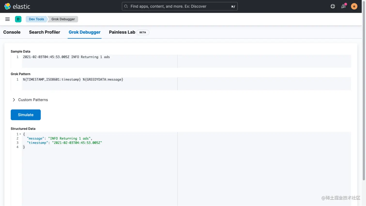完成此操作的最简单方法是使用摄取管道(ingest pipeline)。 但在我们开始之前,我们将复制一行日志并转到 Kibana 的 Management > DevTools > Grok Debugger 部分。 在此 UI 中,我们可以轻松创建和测试与我们的自定义日志格式匹配的表达式。 现在我们只对更正时间戳感兴趣,但你可能会说出这项技术在其他方面的用处。