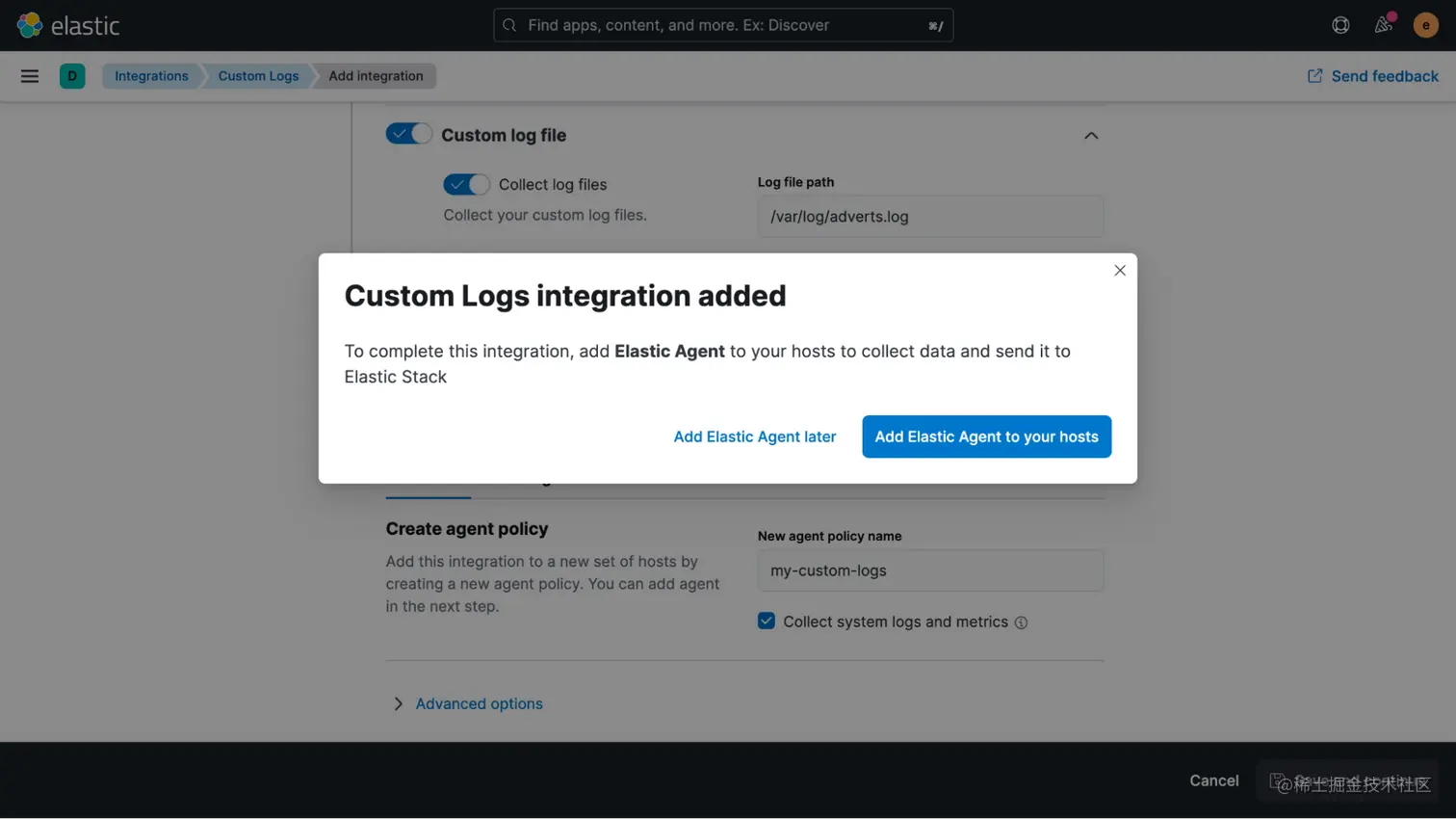 我们将使用 Elastic Agent 从服务器读取一个简单的日志文件。 我们将只使用它的 “自定义日志” 集成,但如果你有其他想要加入的数据源,请查看我们提供的数百个其他 Elastic 集成!