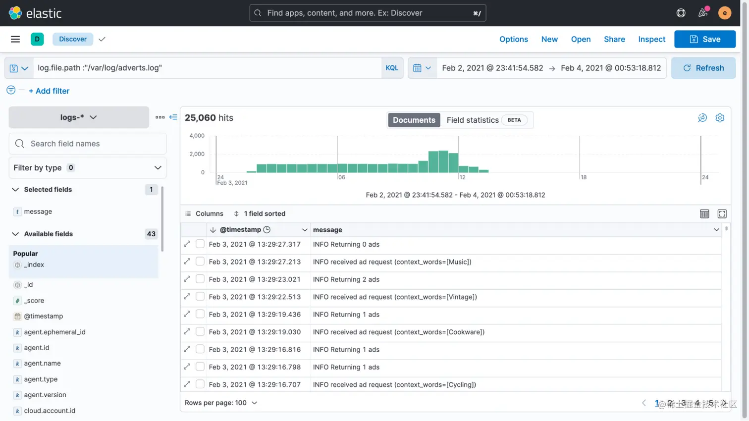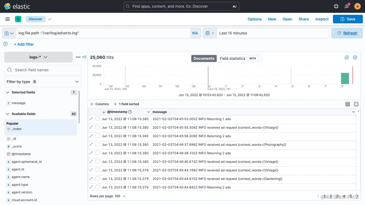 这将从我们添加的路径中搜索所有日志,并通过管道发送它们来更新它们。 如果我们现在再次返回 Discover UI 查看日志,我们会看到时间戳已被正确解析和更新。