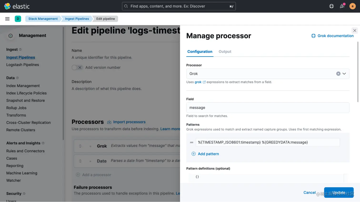 一旦返回的结构化数据被确认为良好,复制 Grok 模式并转到 “Management > Stack Management > Ingest Pipelines” UI,我们在其中创建一个新管道并添加一个 Grok 处理器和一个数据处理器。 在我们的示例中,我们将此管道称为 logs-timestamp。