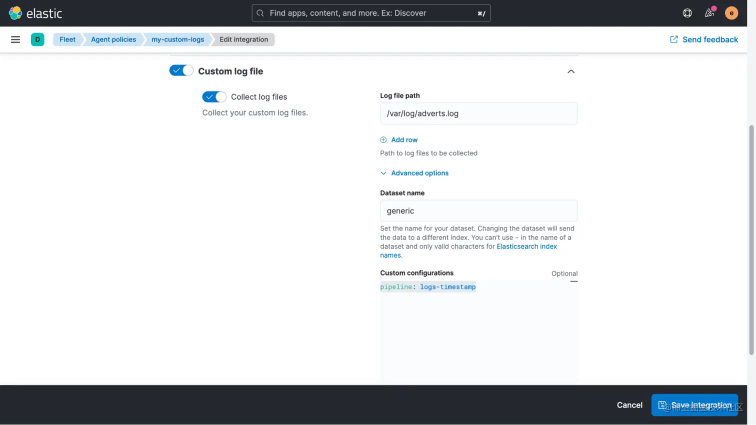 展开 Custom log file 部分,然后展开 Advanced options,我们可以添加 pipeline:logs-timestamp 作为自定义配置。