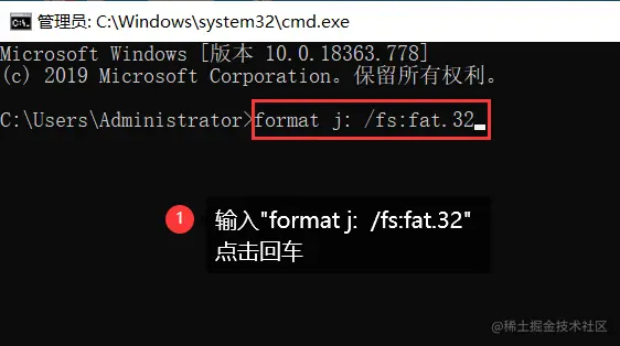 第2步: 接着在DOS窗口输入【format j: /fs:fat.32】,其中的j是代表U盘的盘符,点击回车;