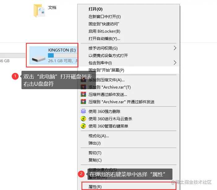 第1步: 将U盘插入电脑,识别成功后。鼠标双击打开【此电脑】,右击U盘,点击【属性】;
