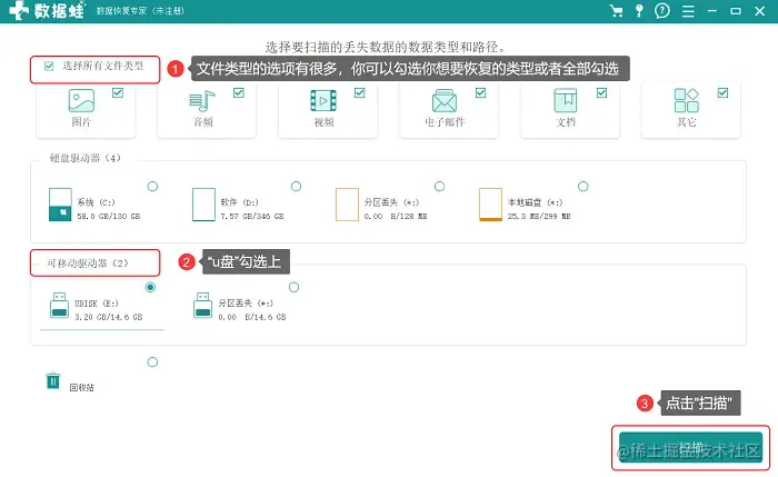 第1步: 在【扫描】之前,选择所有文件类型以使结果更全面。选择【U盘】扫描位置。选择它并单击【扫描】。