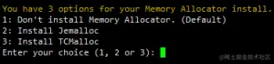 选择是否安装内存优化:可以选择不安装、Jemalloc或TCmalloc,输入对应序号回车,直接回车为默认为不安装。