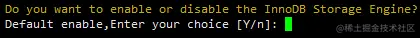 询问是否需要启用MySQL的InnoDB,InnoDB引擎默认为开启,一般建议开启,直接回车或输入y。如果确定确实不需要该引擎可以输入n,(MySQL5.7+版本无法关闭InnoDB),输入完成,回车进入下一步;