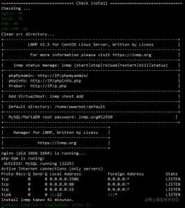 LNMP脚本就会自动安装编译Nginx、MySQL、PHP、phpMyAdmin等软件及相关的组件。安装时间可能会几十分钟到几个小时不等,主要是机器的配置网速等原因会造成影响。