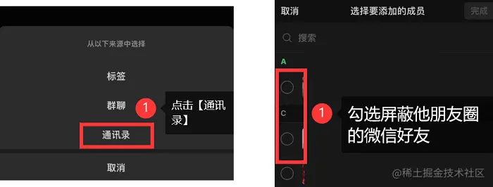 **步骤4:**来源方式点击【通讯录】,选择需要屏蔽朋友圈的微信好友,最后点击【完成】即可完成屏蔽他人的朋友圈啦。