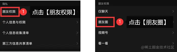 **步骤2:**在隐私选项中找到【朋友权限】,点击进入后,接着找到并点击【朋友圈】。
