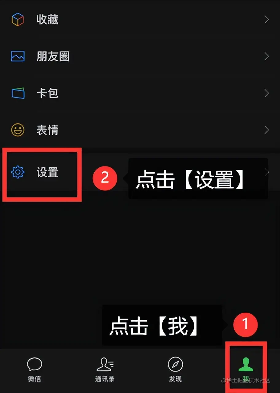 **步骤1:**点击微信下方的【我】,在【我】的界面中点击【设置】。