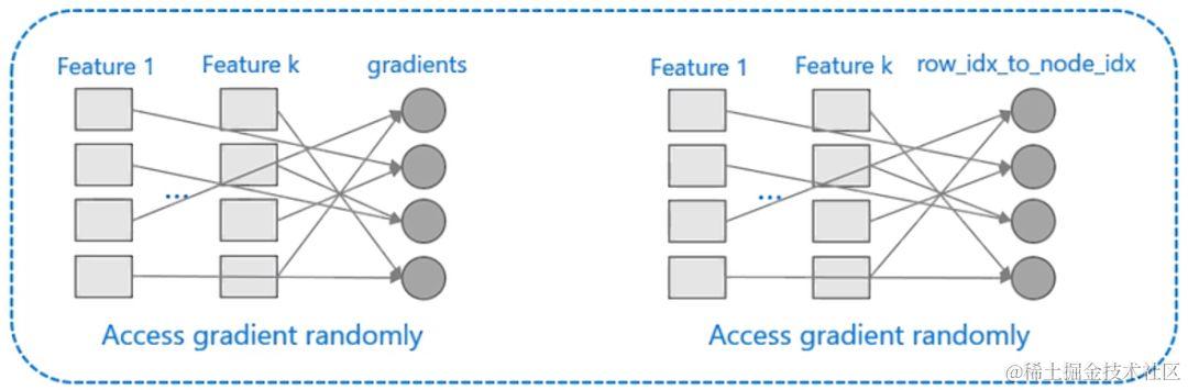 XGBoost对cache优化不友好,如下图所示。在预排序后,特征对梯度的访问是一种随机访问,并且不同的特征访问的顺序不一样,无法对cache进行优化。同时,在每一层长树的时候,需要随机访问一个行索引到叶子索引的数组,并且不同特征访问的顺序也不一样,也会造成较大的cache miss。为了解决缓存命中率低的问题,XGBoost 提出了缓存访问算法进行改进。