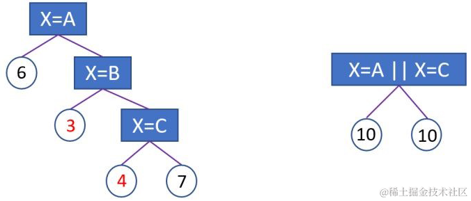 图:左图为基于 one-hot 编码进行分裂,右图为 LightGBM 基于 many-vs-many 进行分裂