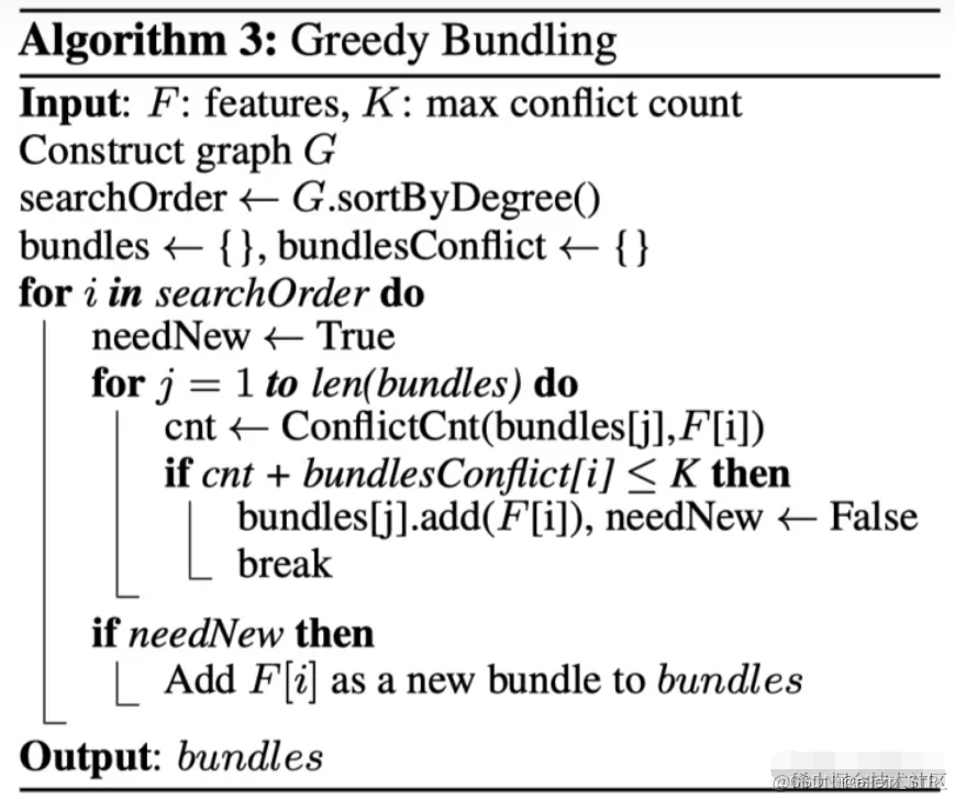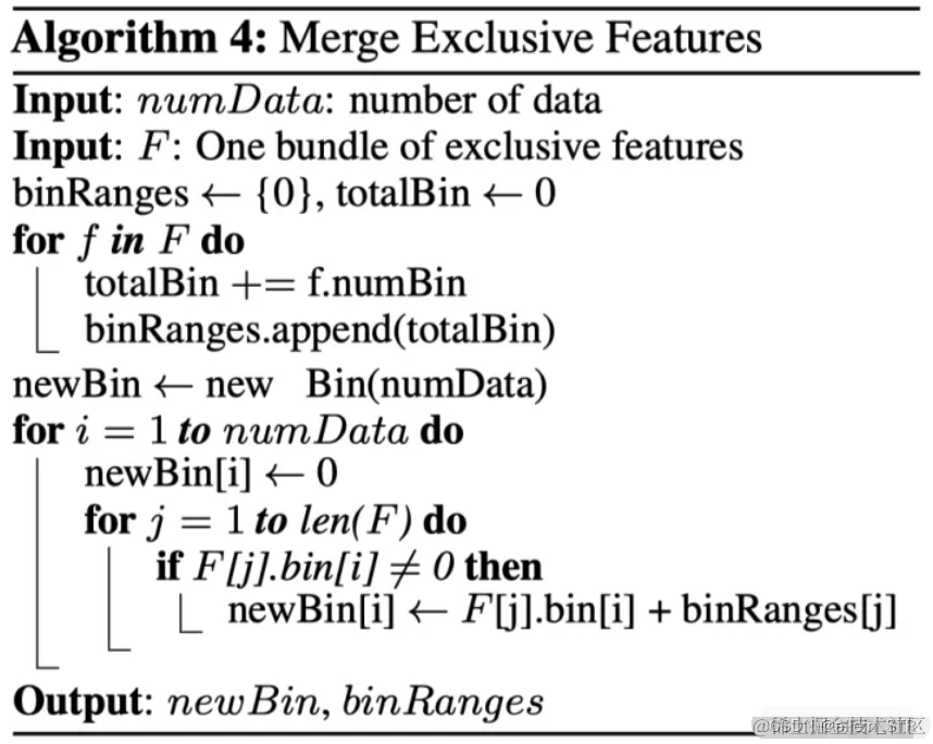 对于问题2: 论文给出特征合并算法,其关键在于原始特征能从合并的特征中分离出来。假设 Bundle 中有两个特征值,A 取值为 [0, 10]、B 取值为 [0, 20],为了保证特征 A、B 的互斥性,我们可以给特征 B 添加一个偏移量转换为 [10, 30],Bundle 后的特征其取值为 [0, 30],这样便实现了特征合并。具体算法如下所示: