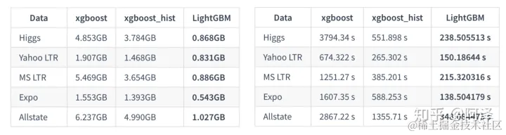 下图分别显示了 XGBoost、XGBoost_hist(利用梯度直方图的 XGBoost) 和 LightGBM 三者之间针对不同数据集情况下的内存和训练时间的对比:来源:【机器学习】决策树(下)——XGBoost、LightGBM(非常详细) - 知乎 (zhihu.com)