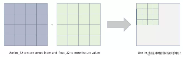 - 内存占用更小: 直方图算法不仅不需要额外存储预排序的结果,而且可以只保存特征离散化后的值,而这个值一般用 8 位整型存储就足够了,内存消耗可以降低为原来的 1/8 。也就是说XGBoost需要用 32 位的浮点数去存储特征值,并用 32 位的整形去存储索引,而 LightGBM只需要用 8 位去存储直方图,内存相当于减少为1/8 ;(以k=256为例)