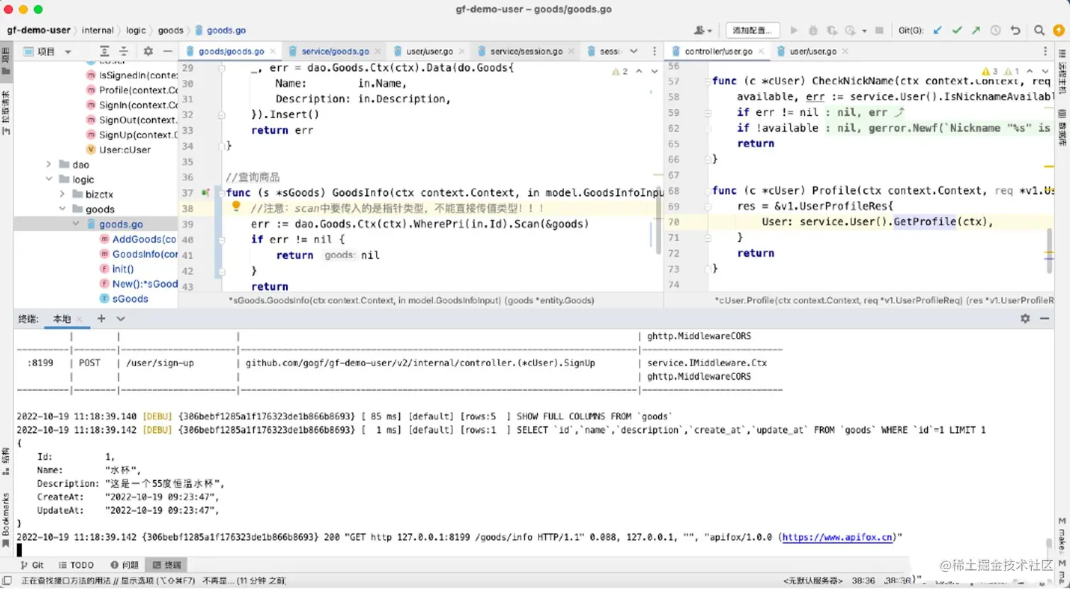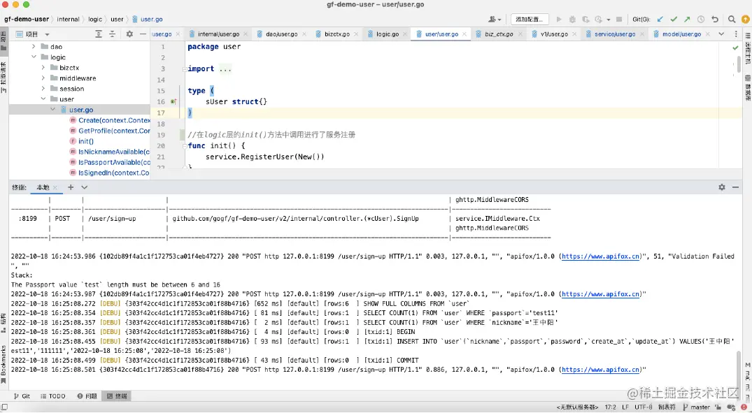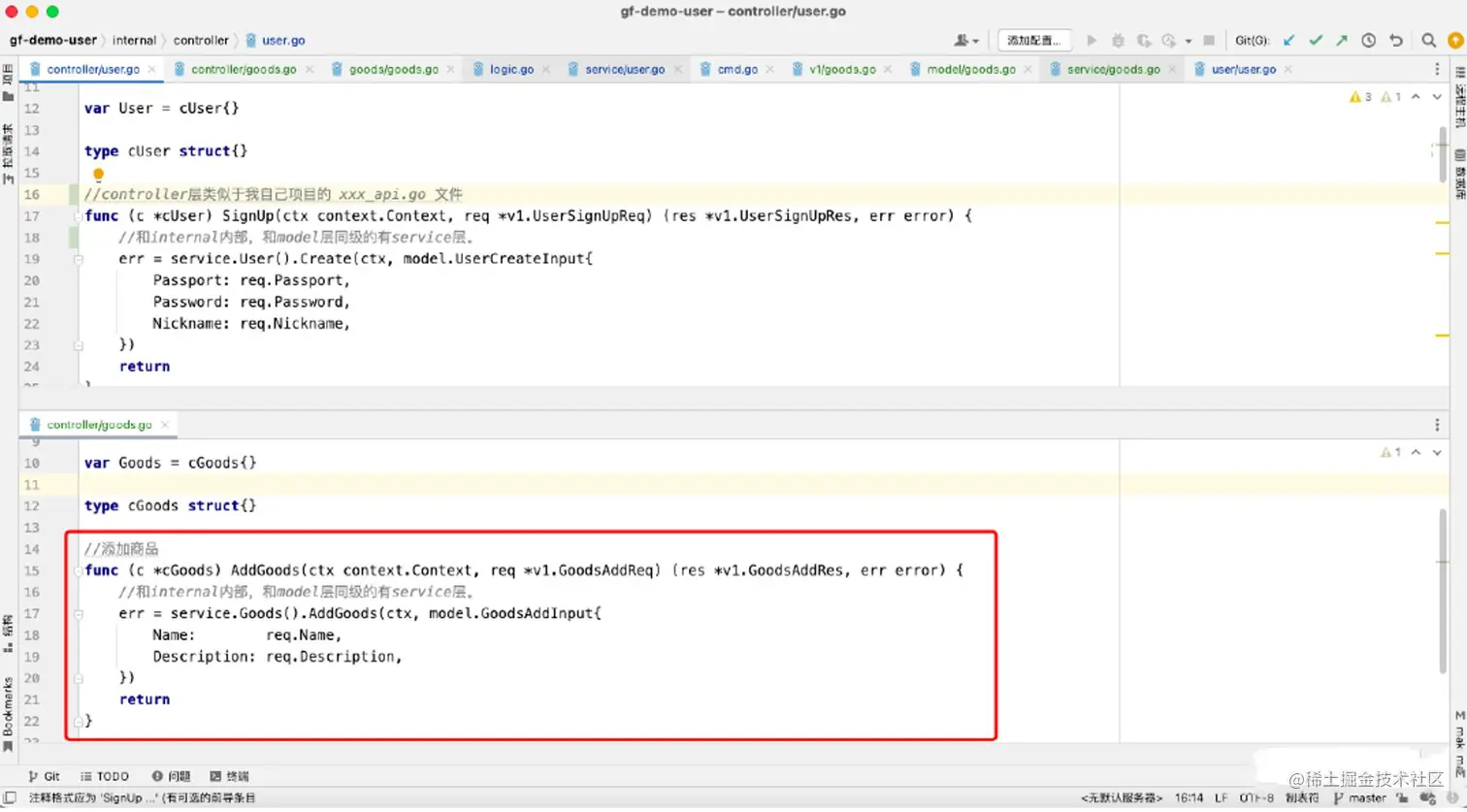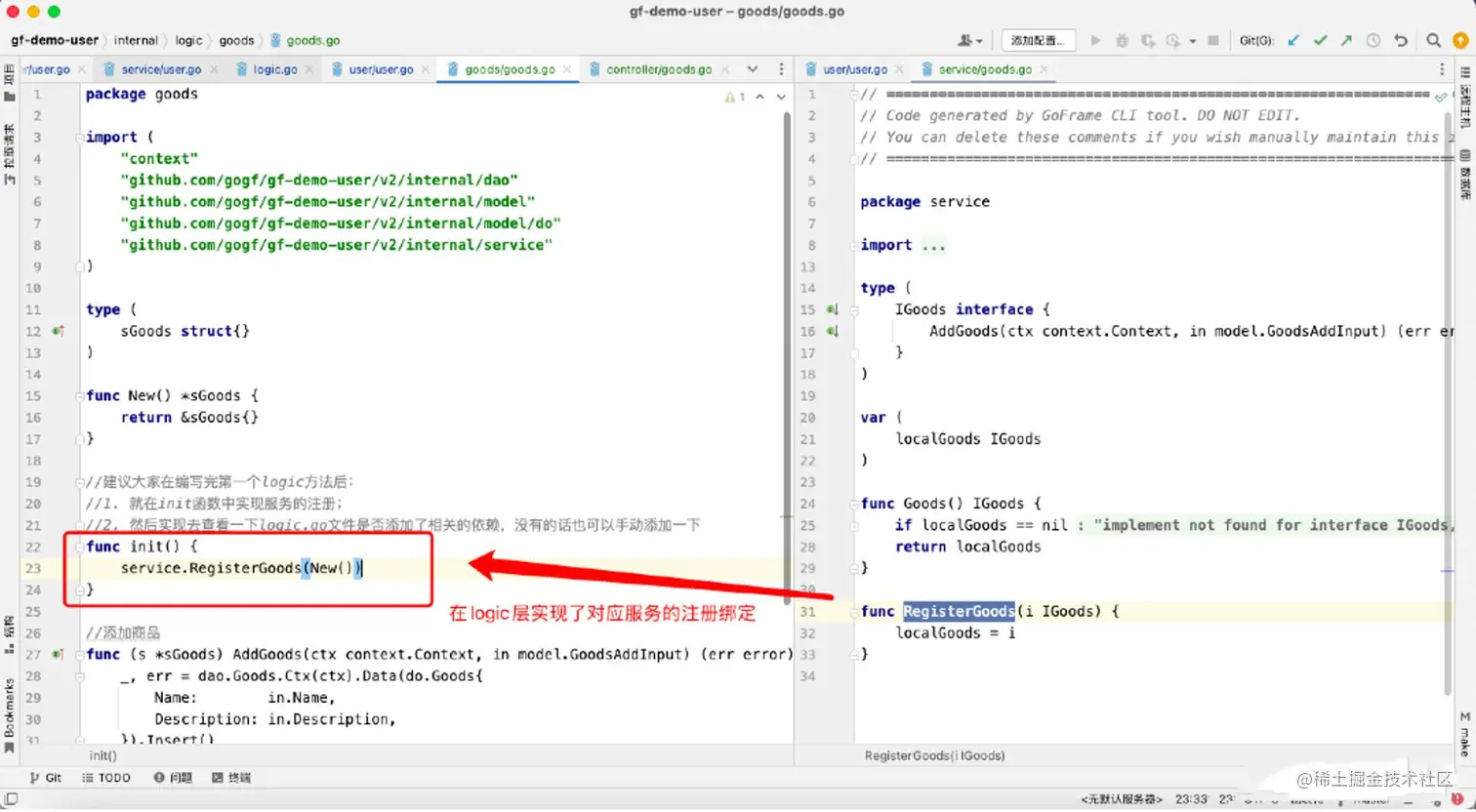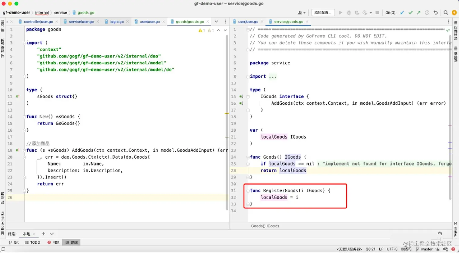 编写logic层,自动生成service层代码。(通过配置goland File Watcher自动生成,也可以通过gf gen service手动执行脚本生成,强烈建议前者)